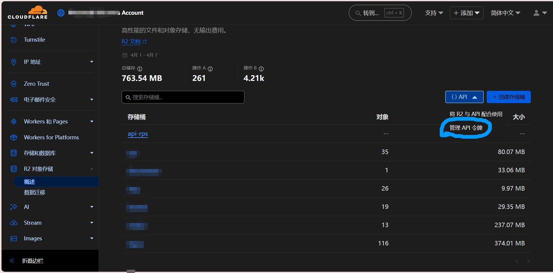 完毕后,返回R2主页,然后如下图操作:点击API→管理API令牌(蓝圈示意)