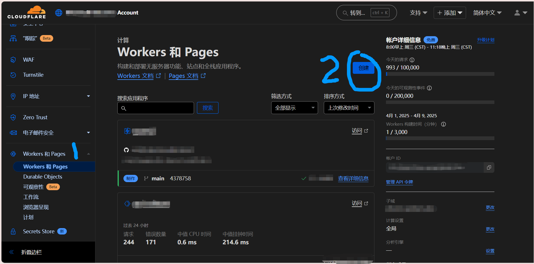 打开Cloudflare仪表板→Workers和Pages→创建(如下图所示)